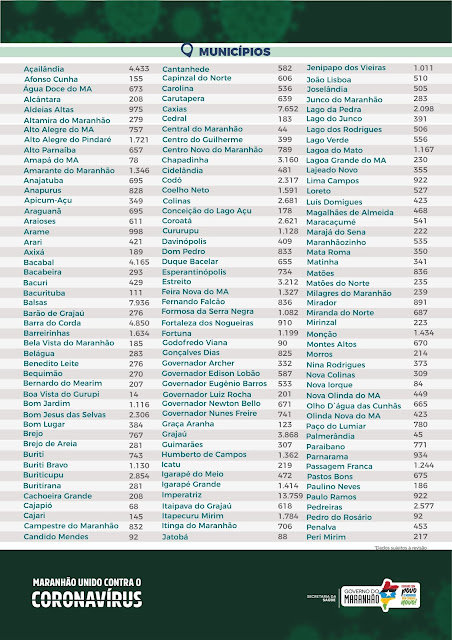 As 46 novas mortes ocorreram nas seguintes cidades: São Luís (10), Imperatriz (8), São José de Ribamar (3), Carutapera (2), Estreito (2), Paço do Lumiar (2), Timon (2), Balsas (1), Belágua (1), Bequimão (1), Buriti Bravo (1), Cajari (1), Caxias (1), Davinópolis (1), Grajaú (1), Igarapé do Meio (1), Santa Rita (1), São João do Carú (1), São João do Paraíso (1), São Pedro da Água Branca (1), Tasso Fragoso (1), Tuntum (1), Urbano Santos (1), e Zé Doca (1).