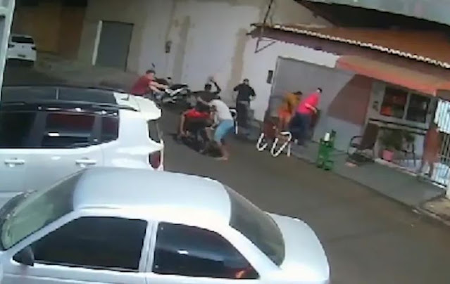 assaltantes passando em uma motocicleta na porta da casa onde as vítimas
